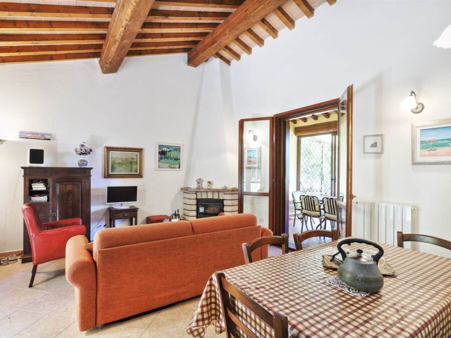 Das Haus bezaubert durch seinen charmanten, landestypischen Stil: warme Terrakottaböden, Holzdecken und eine durchdachte Raumaufteilung, die ein Gefühl von Geborgenheit vermittelt. Der großzügige Wohnbereich mit Kamin lädt an kühleren Abenden zum Träumen ein, während die teils überdachte Terrasse der ideale Platz ist, um bei einem Glas Wein den Blick über die weichen Linien der toskanischen Landschaft schweifen zu lassen.